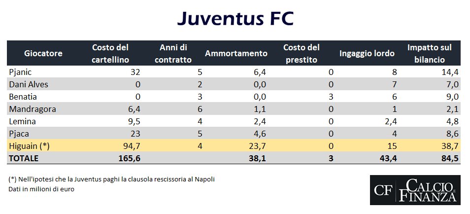 Fin qui la cronaca. Ma quale sarebbe l’impatto dell’acquisto di Higuain sul bilancio 2016-2017 della Juventus? Nei giorni scorsi su CF Calcio e Finanza avevamo già simulato questa operazione (le cifre erano le medesime di quelle riportate da Di Marzio) ed eravamo giunti alla conclusione che l’arrivo in bianconero del centravanti argentino sarebbe stato sostenibile anche senza la cessione da parte della Juve di qualche big, come Paul Pogbà (nel frattempo sono diventate sempre più insistenti le voci di un suo passaggio al Manchester United), o Leonardo Bonucci (accostato prima al Chelsea di Antonio Conte e poi al Manchester City di Pep Guardiola).