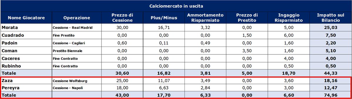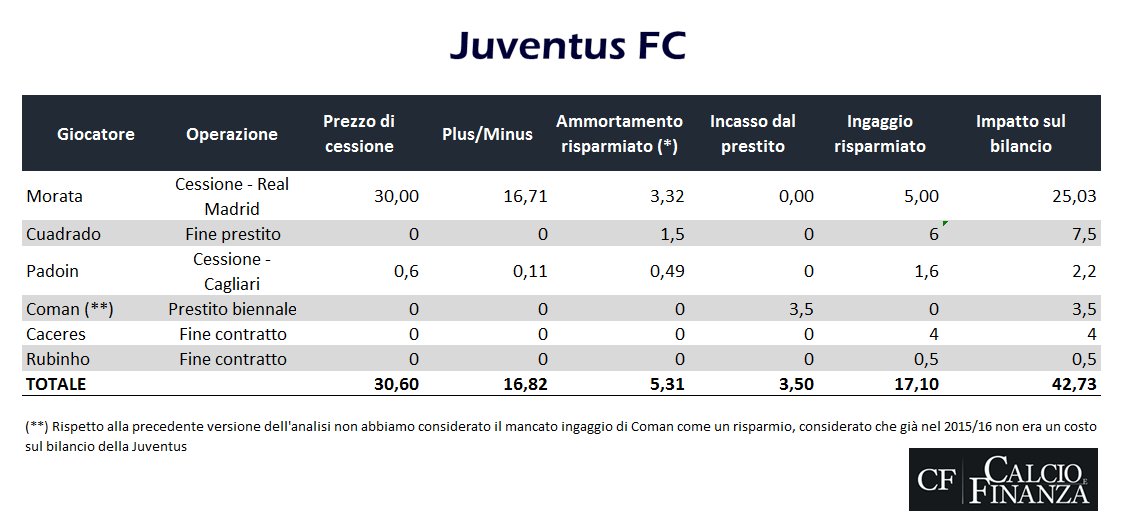 E’ dunque evidente che per non appesantire in modo importante il prossimi bilancio la Juventus dovrà procedere a qualche cessione in modo da compensare i costi legati al mercato in entrata con plusvalenze e risparmi di costi (minori ammortamenti e minori ingaggi).