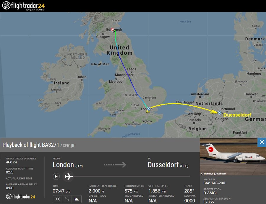 WDL Avn BAe 146-200 (D-AMGL, built 1986) on ops for BA Citiflyer #BA3271 mistakenly flew to Edinburgh instead of it’s intended destination Duesseldorf, Germany allegedly due to flightplan irregularities. The flight landed safely. https://www.bbc.com/news/business-47691478 … https://bit.ly/2UTi7ZO