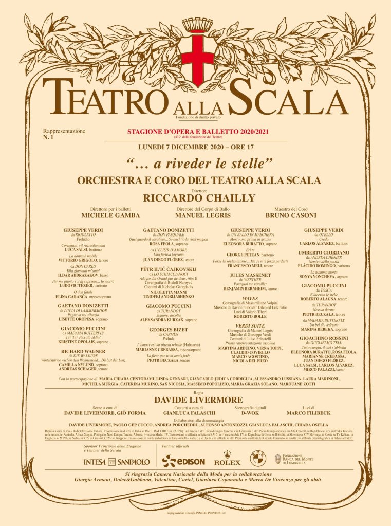 01 – F. Cilea – “Io son l’umile ancella” da Adriana Lecouvreur – Registrazione 02 – Inno di Mameli 03 – G. Verdi – Preludio da Rigoletto 04 – G. Verdi – “Cortigiani vil razza dannata” da Rigoletto – Luca Salsi 05 – G. Verdi – “La donna è mobile” da Rigoletto – Vittorio Grigolo 06 – G. Verdi – “Ella giammai m’amò” da Don Carlo – Ildar Abdrazakov 07 – G. Verdi – “Per me giunto” da Don Carlo – Ludovic Tézier 08 – G. Verdi – “O don fatale” da Don Carlo – Elīna Garanča 09 – G. Donizetti – “Regnava nel silenzio” da Lucia di Lammermoor – Lisette Oropesa 10 – G. Puccini – “Tu, tu piccolo Iddio” da Madama Butterfly – Kristine Opolais 11 – R. Wagner – “Winterstürme” da Walküre – Camilla Nylund, Andreas Schager 12 – G. Donizetti – “So anch’io la virtù magica” da Don Pasquale – Rosa Feola 13 – G. Donizetti – “Una furtiva lacrima” da Elisir d’amore – Juan Diego Flórez 14 – Lo Schiaccianoci– Adagio dal Grand pas de deux, Atto II con Nicoletta Manni e Timofej Adrijashenko 15 – G. Puccini – “Signore ascolta” da Turandot – Aleksandra Kurzak 16 – G. Bizet – Preludio da Carmen 17 – G. Bizet – “Habanera” da Carmen – Marianne Crebassa 18 – G. Bizet – “La fleur que tu m’avais jetée” da Carmen – Piotr Beczala 19 – G. Verdi – “Morrò, ma prima in grazia” da Un ballo in maschera – Eleonora Buratto 20 – G. Verdi – “Eri tu” da Un ballo in maschera – George Petean 21 – G. Verdi – “Ma se m’è forza perderti” da Un ballo in maschera – Francesco Meli 22 – J. Massenet – “Pourquoi me réveiller” da Werther – Benjamin Bernheim 23 – “Waves” – Roberto Bolle 24 – “Verdi Suite” – Estratti dai ballabili da I Vespri siciliani, Jérusalem, Il trovatore – Coreografia Manuel Legris con Martina Arduino, Virna Toppi, Claudio Coviello, Marco Agostino, Nicola Del Freo 25 – G. Verdi – “Credo” da Otello – Carlos Álvarez 26 – U. Giordano – “Nemico della patria” da Andrea Chénier – Plácido Domingo 27 – U. Giordano – “La mamma morta” da Andrea Chénier – Sonya Yoncheva 28 – G. Puccini – “E lucevan le stelle” da Tosca – Roberto Alagna 29 – G. Puccini – “Nessun dorma” da Turandot – Piotr Beczala 30 – G. Puccini – “Un bel dì vedremo” da Madama Butterfly – Marina Rebeka 31 – G. Rossini – “Tutto cangia”, finale da Guglielmo Tell – Eleonora Buratto, Rosa Feola, Marianne Crebassa, Juan Diego Flórez, Luca Salsi, Carlos Álvarez, Mirco Palazzi