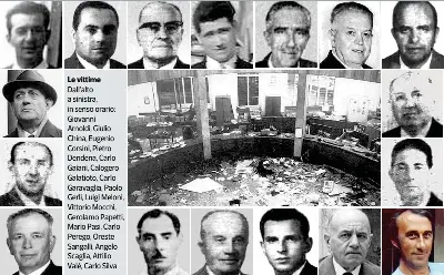 Le vittime Dall’alto a sinistra, in senso orario: Giovanni Arnoldi, Giulio China, Eugenio Corsini, Pietro Dendena, Carlo Gaiani, Calogero Galatioto, Carlo Garavaglia, Paolo Gerli, Luigi Meloni, Vittorio Mocchi, Gerolamo Papetti, Mario Pasi, Carlo Perego, Oreste Sangalli, Angelo Scaglia, Attilio Valè, Carlo Silva