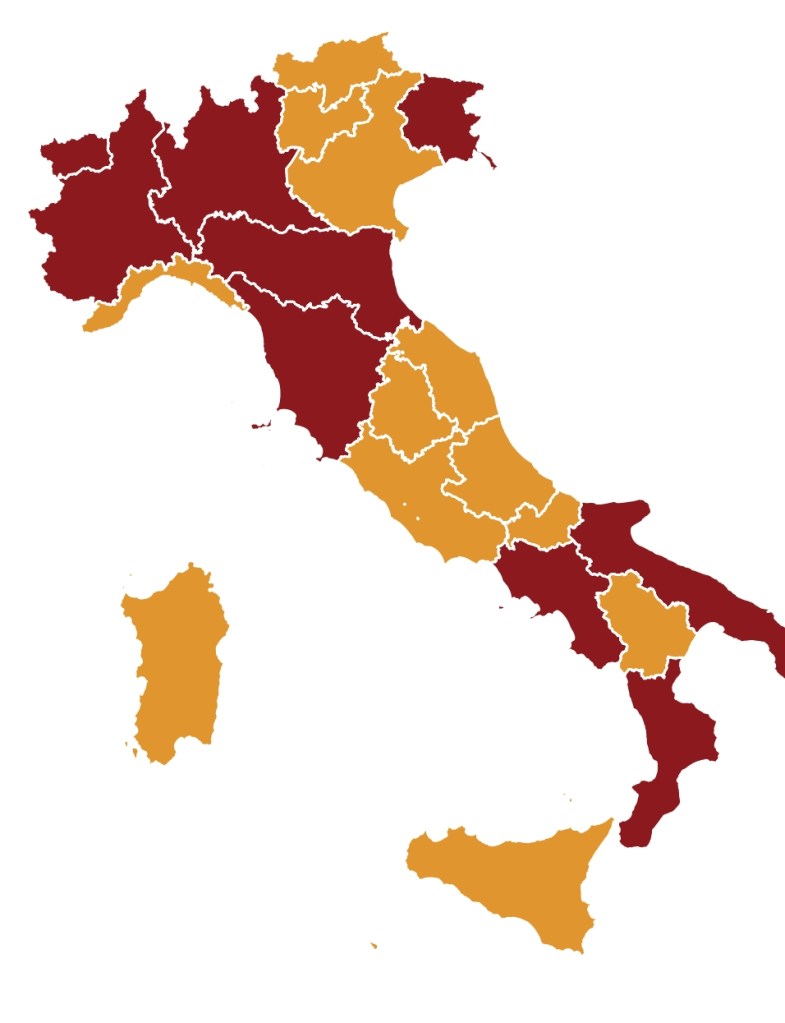 Sono in fascia rossa Calabria, Campania, Emilia-Romagna, Friuli-Venezia Giulia, Lombardia, Piemonte, Puglia, Toscana e Valle d’Aosta.