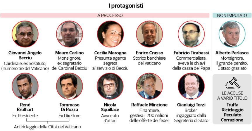 Gli imputati – Davanti a una corte (di laici) e all’opinione pubblica di tutto il mondo verranno ripercorsi, analizzati e giudicati dieci anni di gestione segreta delle finanze del Vaticano. Oltre a Becciu, alla sbarra ci sono il suo ex segretario monsignor Mauro Carlino, la sedicente agente segreta «ingaggiata» da Becciu, Cecilia Marogna, lo storico banchiere del Vaticano Enrico Crasso, il commercialista che aveva le chiavi della cassa del Papa Fabrizio Tirabassi, gli ex vertici dell’Aif, l’Antiriciclaggio vaticano, René Brülhart e Tommaso Di Ruzza (per solo abuso d’ufficio), l’avvocato d’affari Nicola Squillace, il finanziere a cui sono stati dati in gestione 200 milioni delle offerte dei fedeli Raffaele Mincione, e il broker di valute incaricato dalla Segreteria di Stato di tutelare quel patrimonio, Gianluigi Torzi, poi arrestato con l’accusa di estorsione ai danni della Santa Sede.