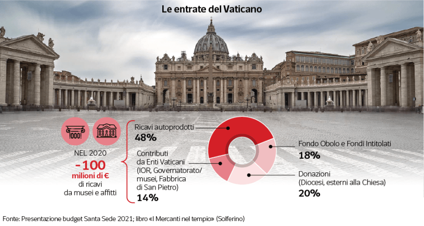 L’obolo ricapitalizza l’azienda – Ma a quanto ammonta il buco del Vaticano? Per tre anni, fino al 2018 compreso, i bilanci della Santa Sede non sono stati resi pubblici, ma hanno sempre chiuso in perdita. Nel 2016 il bilancio vaticano ha perso 3 milioni, l’anno dopo 32 milioni. Nel 2018 ne ha bruciati 75, nel 2019 altri 11 e infine 66 l’anno scorso. Nel 2020, infatti, al deficit strutturale si è aggiunto il Covid: con i Musei Vaticani (i più visitati al mondo) chiusi per quasi un anno e minori affitti incassati dagli inquilini, c’è stato un calo di circa 100 milioni di ricavi.