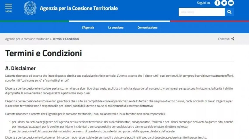 Non solo grandi enti, ma anche alcune agenzie hanno scelto di usare queste espressioni per richiamare l’attenzione dell’utente sul rischio e pericolo che corre esplorando i loro siti. È il caso dell’Agenzia per la coesione territoriale, che deve promuovere lo sviluppo economico e fornire un supporto all’attuazione della programmazione comunitaria e nazionale, lavorando con le amministrazioni centrali, regionali e con gli enti locali. Il suo portale è ricco di informazioni, grafici e mappe interattive dedicate al monitoraggio della politica di coesione, sia attraverso una pagina web sul sito (attualmente la sezione è in corso di aggiornamento a seguito dell’emergenza Covid-19) sia attraverso un link al portale esterno di Opencoesione. Inoltre ospita anche una banca dati che permette di conoscere e analizzare, a livello regionale, i flussi finanziari delle amministrazioni pubbliche e di tutti gli enti che fanno parte della categoria del settore pubblico allargato. Eppure, anche su questa mole di dati, elegantemente presentati e facilmente visualizzabili dal pubblico, pende il disclaimer dell’Agenzia: «L’utente accetta che il sito e tutti i suoi contenuti, ivi compresi i servizi eventualmente offerti, sono forniti “così come sono” e “con tutti gli errori”». L’ente non rilascia alcuna garanzia sui contenuti pubblicati, non assicura che il portale sia «privo di errori o virus, bachi o “cavalli di Troia”» e quindi non si ritiene responsabile per danni subiti dall’utente «a causa di tali elementi di carattere distruttivo» o per qualsiasi danno legato all’uso del sito o di altri portali ad esso collegati da un link.