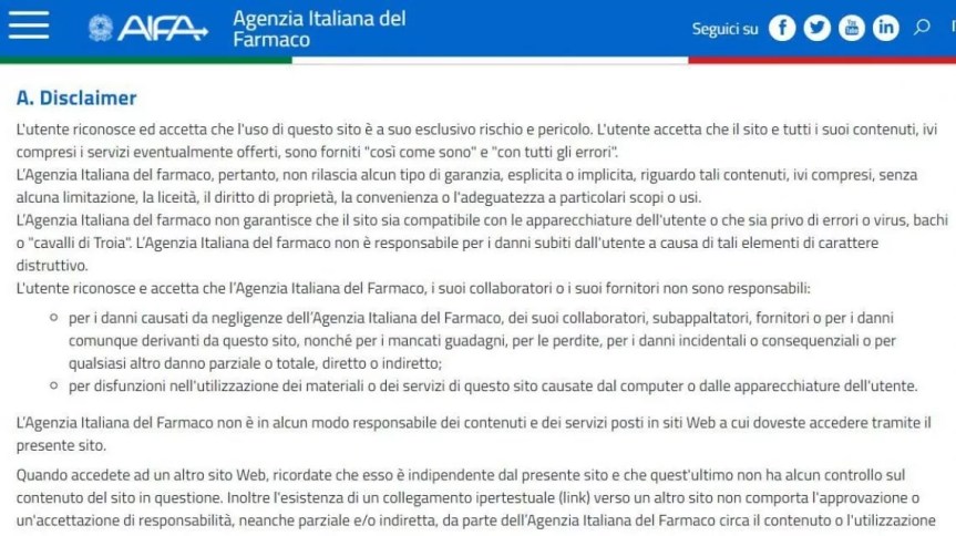 L’Agenzia italiana del farmaco (Aifa) ne è un esempio. Il disclaimer sul suo sito è uguale ai precedenti. E quindi l’utente non deve aspettarsi contenuti garantiti dall’ente, né che l’Aifa si assuma le responsabilità per eventuali danni subiti. Eppure è un portale fondamentale per avere informazioni sull’uso e sul consumo dei farmaci, è che è diventato ancora più importante durante la pandemia. Con mappe e tabelle, il sito fornisce dei report sull’andamento delle somministrazioni di vaccini; inoltre, raccoglie notizie e aggiornamenti sulle sperimentazioni in corso, sui medicinali utilizzati al di fuori delle sperimentazioni cliniche, raccomandazioni sull’utilizzo dei farmaci nella popolazione esposta al virus, oltre a una serie di Faq sui vaccini anti Covid-19. Uno strumento informativo utilissimo per il cittadino, che però utilizzandolo deve accettare tutta una serie di condizioni per nulla rassicuranti. Sempre che riesca a trovare e leggere le note legali, a cui si può accedere dal sito cliccando un link posizionato in fondo alla pagina.