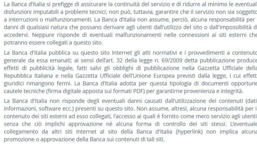 Un discorso a parte va fatto perBanca d’Italia. Il portale è un enorme bacino di rapporti, informazioni e dati di tipo finanziario, liberamente consultabili da privati e imprese. Inoltre, l’ente pubblica sul sito gli atti normativi e i provvedimenti a contenuto generale da esso emanati, utilizzando anche delle cautele tecniche per questo tipo di documenti. Come precisa un disclaimer, la firma digitale viene apposta sui formati Pdf per «garantirne provenienza e integrità». Inoltre l’ente cura l’aggiornamento del sito e «si prefigge di assicurare la continuità del servizio e di ridurre al minimo le eventuali disfunzioni imputabili a problemi tecnici». Ma poi si legge che l’ente non risponde di eventuali danni causati «dall’utilizzazione dei contenuti (dati, informazioni, software ecc.)presenti su questo sito». Una formula vaga per indicare che, in ogni caso, dobbiamo fare attenzione a rischi e problemi non meglio specificati e quindi difficili da immaginare. Una dichiarazione di esclusione di responsabilità che riguarda anche i contenuti di siti esterni collegati al portale.