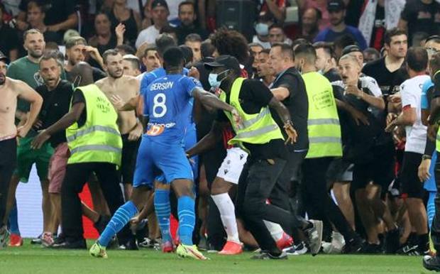 A quel punto scatta un’invasione di campo, che fa arrabbiare ancora di più il tecnico argentino dell’OM. Il lancio di una bottiglia provoca la reazione accesa, i tifosi del Nizza penetrano sul terreno di gioco e inseguono i calciatori dell’OM. La partita viene interrotta.