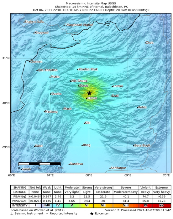 epa09510082 A handout shakemap made available by the United States Geological Survey (USGS) shows the location of a 5.7-magnitude earthquake hitting the Balochistan province in Pakista, 07 October 2021. EPA/USGS HANDOUT HANDOUT EDITORIAL USE ONLY/NO SALES