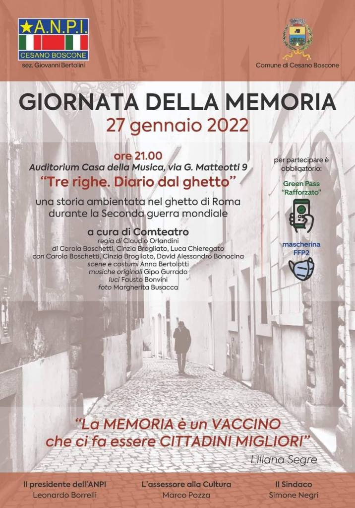 ⚫ Cesano Boscone celebrerà la Giornata della commemorazione delle vittime dell’Olocausto con lo spettacolo teatrale “Tre righe. Diario dal ghetto”, a cura di Comteatro. Una storia ambientata nel ghetto di Roma, durante la Seconda guerra mondiale.