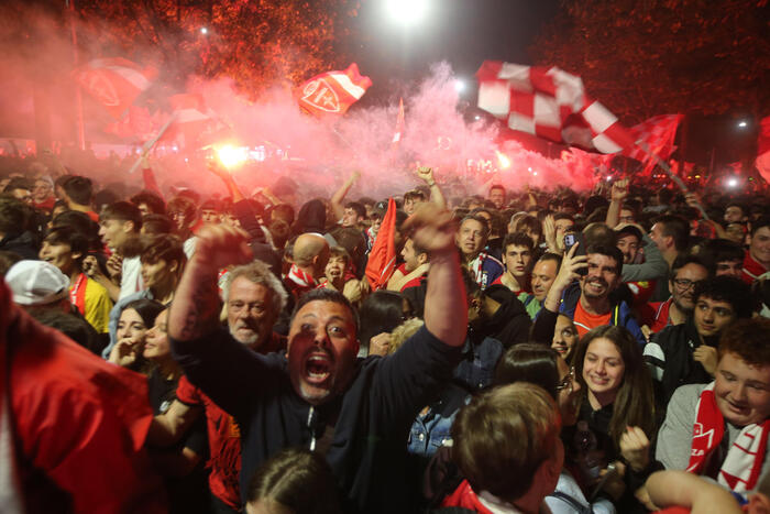 Un boato di gioia si è alzato fuori dallo stadio Brianteo di Monza, al fischio finale del match Pisa-Monza, che ha decretato il passaggio dei biancorossi brianzoli in Serie A. Dal truck con il maxischermo allestito dal Comune di Monza accanto alla struttura sportiva, dove centinaia di tifosi che hanno seguito il diretta la partita del riscatto, è partito il corteo festoso di auto e bandiere, diretto al centro della città.