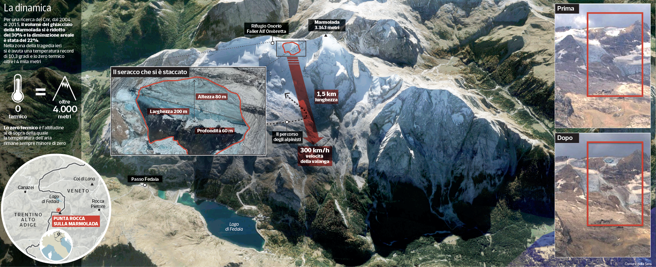 «Corpi martoriati» – «C’era gente irriconoscibile, sfigurata, corpi martoriati… d’altra parte la massa caduta è enorme e ha effetti devastanti», racconta Alex Barattin, responsabile del Soccorso Alpino di Belluno che è volato sul luogo della sciagura. Le dimensioni del distacco sono eccezionali: circa 200 metri il fronte che è venuto giù per un chilometro e mezzo a circa 300 all’ora ingigantendosi fino a 400 metri di larghezza. Tutto materiale solido, pochissima neve, consumata anzitempo in questa estate torrida che vede lo zero termico collocarsi ben al di sopra dei 3.343 metri di Punta Penia, la vetta della Marmolada, la più alta delle Dolomiti (ieri alle 13 c’erano 10 gradi in vetta). continua a leggere