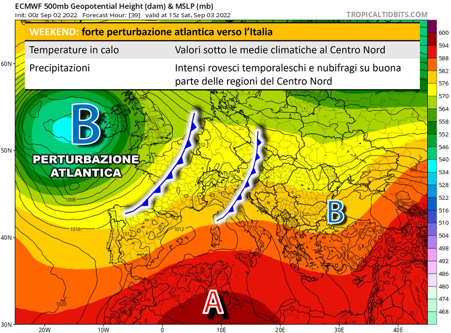Che batosta nel weekend! Tutto confermato: il primo fine settimana di Settembre sarà all’insegna di una forte instabilità:, ma l’Italia sarà in realtà divisa in due: se da un latol’arrivo di un fronte perturbatodarà un duro colpo all’Estate su buona parte del Centro-Nord, provocando frequenti piogge e temporali non solo Sabato 3, ma anche Domenica 4 Settembre, dall’altro il Sud e le Isole maggiori saranno protetti da uno scudo anticiclonico in progressivo avanzamento, il quale garantirà sole e caldo su quasi tutte le regioni meridionali.