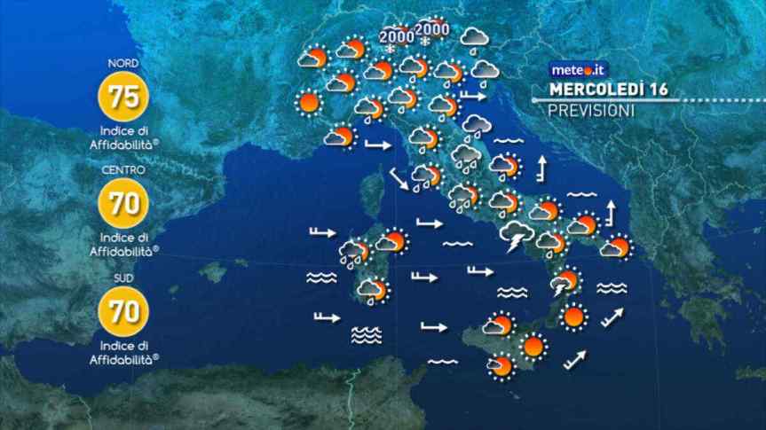 Le previsioni meteo per mercoledì 16 novembre – Nuvole in tutta Italia, ma con tendenza a graduali schiarite al Nordovest. Nel corso del giorno piogge sparse al Nordest, Lombardia Orientale, tutte le regioni centrali, Campania, Calabria Tirrenica e Sardegna; neve sulle Alpi, ma solo a quote elevate, oltre 1900-2000 metri.Temperature massime in crescita in gran parte d’Italia e in generale leggermente oltre la norma.