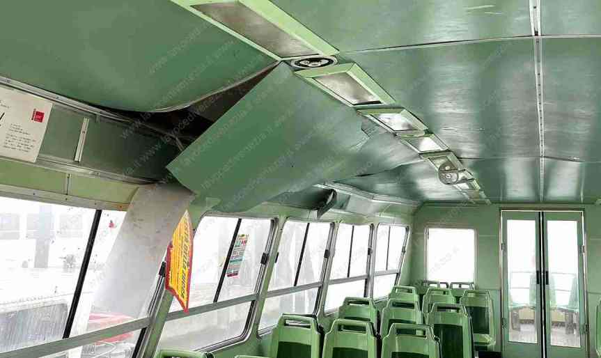 Il momento della collisione tra ferry e vaporetto e i danni allo scafo del secondo