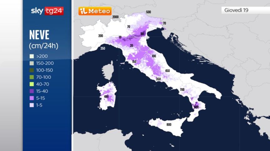 Infine, novità dell’ultima ora, la neve farà la sua comparsa fino a quote di alta pianura (150/350 metri) anche su Toscana, Marche, Sardegna e Lazio.