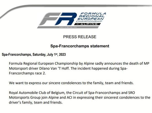 Il cordoglio della fedarazione – «Il Formula Regional European Championship annuncia con tristezza la morte del pilota Dilano Van’T Hoff. Esprimiamo le nostre sincere condoglianze alla famiglia, al team e agli amici», si legge nella nota della federazione. «Il Royal Automobile Club del Belgio, il Circuito di Spa-Francorchamps e il Gruppo SRO Motorsports — si legge ancora nel comunicato— si uniscono ad Alpine e all’ACI nell’esprimere le più sincere condoglianze alla famiglia, al team e agli amici del pilota» .