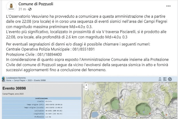 Nel comunicato si spiega che “l’Osservatorio Vesuviano dell’Ingv ha provveduto a comunicare a questa amministrazione che a partire dalle ore 22:08 (ora locale) è in corso una sequenza di eventi sismici nell’area dei Campi Flegrei con magnitudo massima preliminare” di 4, con variazioni in più o in meno di 0.3. “L’evento più significativo, localizzato in prossimità di via V traversa Pisciarelli, si è prodotto alle 22:08, ora locale, alla profondità di 2.6 km”, sempre con la stessa magnitudo. Il Comune, insieme alla Protezione Civile, “segue da vicino l’evolversi della sequenza sismica in atto e fornirà successivi aggiornamenti fino a conclusione del fenomeno“.