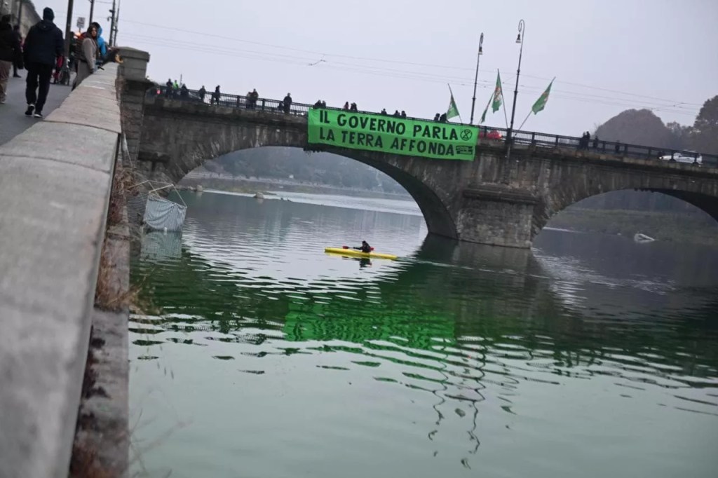 A Torino, la “casa affondata” era in mezzo al Po, di fronte ai Murazzi e nel frattempo, mentre le acque del fiume si tingevano di verde, uno striscione di 45 metri quadri è stato srotolato dal ponte Vittorio Emanuele I di Piazza Vittorio. A Venezia tre persone si sono calate dal Ponte di Rialto, aprendo uno striscione con scritto “Cop28: mentre il governo parla, noi appesi a un filo“. A Roma gli attivisti hanno esposto sull’isola Tiberina un grande striscione con la scritta “Mentre il governo parla, il mondo collassa! Agire ora!“.