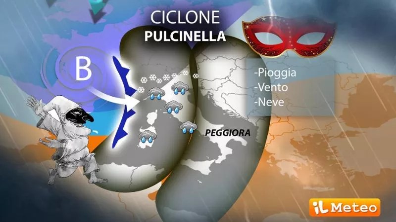 Il ciclone Pulcinella – Insomma, la simpatica maschera napoletana Pulcinella, travestita da ‘Ciclone’ colpirà il nostro Paese con pioggia, vento e neve. Il vento principale sarà lo Scirocco quindi ci attendiamo temperature ancora miti, con la neve che cadrà solo sulle Alpi oltre i 1.500 metri; sugli Appennini la neve sarà ancora un miraggio, purtroppo la pioggia cadrà anche sulle cime più alte.