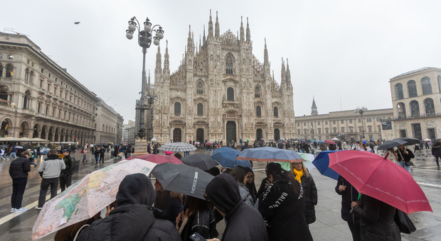 Milano (Italia) – 09-02-2024 – Pioggia e ombrelli in Duomo – Foto Stefano Porta/LaPresse