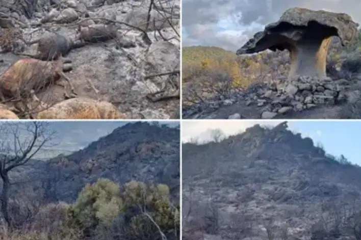 Niente è rimasto – Ora, qui, dentro Perdas Arbas, nel proscenio che fu rigoglioso di Sa Serra, nelle cime a ridosso di Prato Sardo, non è rimasto più niente. Il sughero “ignifugo” che avrebbe dovuto proteggere i mastodontici piloni delle querce più antiche ha resistito sinché ha potuto. Ha ceduto nella notte, quando squadre a terra e in volo hanno dovuto fermarsi per lasciare che quella corona di fuoco, visibile come un vulcano orizzontale in eruzione dalla cima di Badu ‘e Carros, consumasse la sua furia nefasta. Pastori, volontari, Vigili del fuoco e Forestali hanno, come per miracolo, salvato greggi e mandrie, ma quei pascoli ora sono terra bruciata, appesi alla resilienza infinita della natura. Per il resto lì non ci potrà passare nemmeno un quadrupede a spasso, per dieci anni in tutte le aree percorse dalle fiamme è vietato di tutto e di più, a partire dal pascolo e dalla caccia.