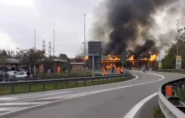 Autostrada A21 chiusa all’altezza del casello di Brescia Sud, devastato da un ampio incendio. Le fiamme sono divampate poco prima delle 14, probabilmente scaturite da un veicolo di passaggio, presumibilmente un furgone carico di gomme, che avrebbe preso fuoco all’improvviso.