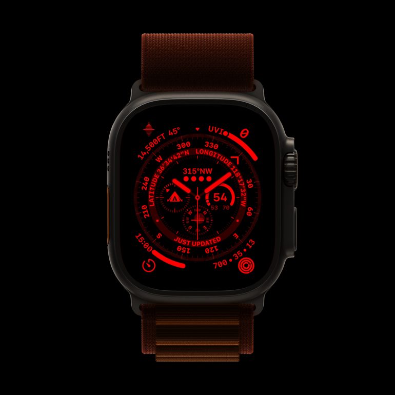 4) Apple Watch Ultra 2 – L’orologio pensato per sportivi ha uno schermo più luminoso (3.000 Nits di picco) e la modalità notte che attiva automaticamente i caratteri in rosso. Sarà possibile collegare accessori Bluetooth per attività sportive.