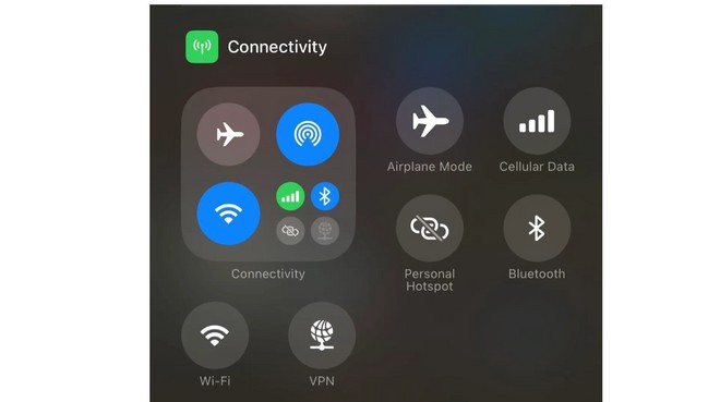 | Apple ha anche aggiunto dei controlli separati per la connettività Wi-Fi e VPN. Nelle versioni precedenti, questi controlli erano integrati in un pulsante. Le nuove opzioni Wi-Fi e VPN non possono essere aggiunte alla schermata di blocco o al pulsante Azione, a differenza della Modalità aereo, Dati cellulare, Hotspot personale, Bluetooth, Wi-Fi e VPN. AirDrop e Satellite restano gli unici controlli non disponibili come autonomi. |