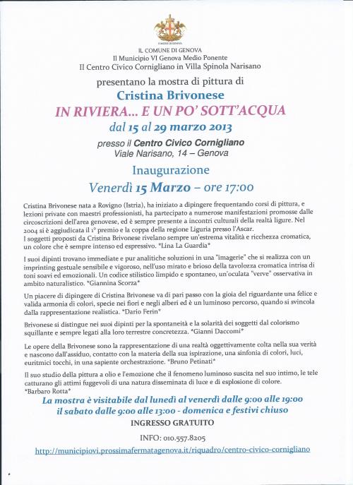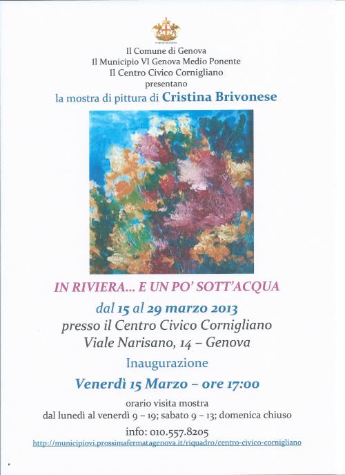 Marzo 2013 – Centro Civico Cornigliano – Mostra Pittura – CRISTINA BRIVONESE ” In riviera… e un pò sott’acqua ”