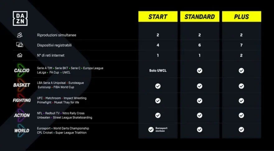 DAZN STANDARD, DAZN PLUS e DAZN START, i piani e i prezzi per il 2024