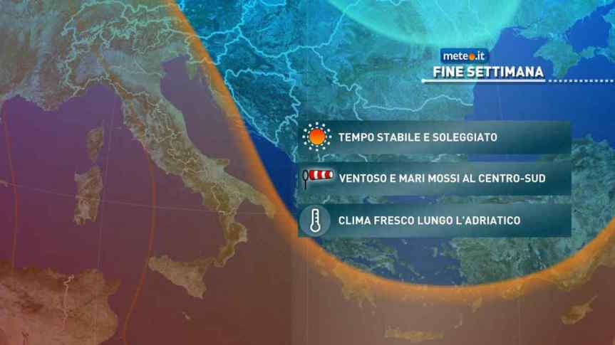 Il fine settimana si prospetta all’insegna del tempo stabile e soleggiato da Nord a Sud. Le giornate saranno però un po’ ventose con mari mossi al Centro-Sud e le temperature faranno registrare valori anche sotto media lungo il versante adriatico.