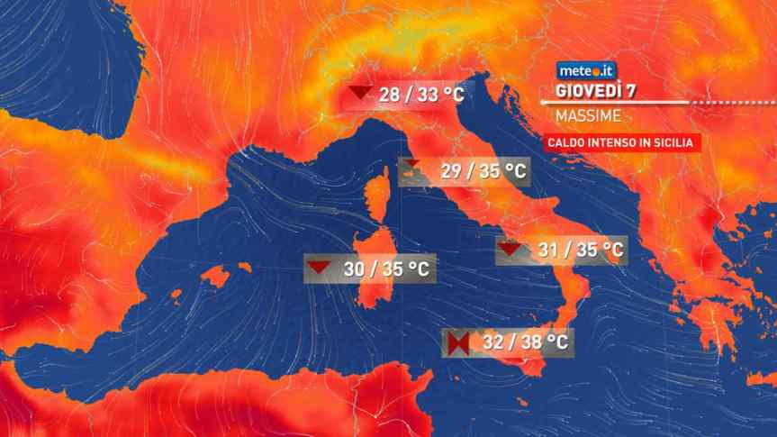Molto caldo in Sicilia con valori fino a 37-38 gradi; valori per lo più tra 30 e 35 gradi altrove. Venti generalmente deboli, salvo un moderatoMaestrale in rinforzo in Sardegna e Canale di Sicilia.