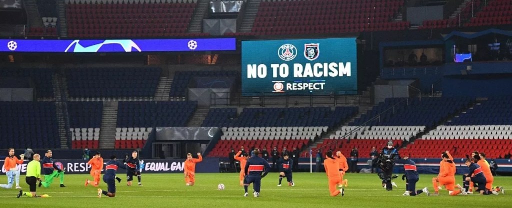 PARIGI – Giocatori e arbitri in ginocchio contro il razzismo. Al Parco dei Principi di Parigi, prima della ripresa della sfida tra il Psg e il Basaksehir (interrotta martedì al 12° minuto dopo che la squadra turca aveva abbandonatoper protesta il campo per le frasi offensive del quarto uomo rumeno Sebastian Coltescu nei confronti di un calciatore nero), i 22 calciatori e la squadra arbitrale si sono inginocchiati e hanno alzato il pugno al cielo durante il tradizionale inno della Champions, gesto diventato simbolo contro ogni forma di discriminazione razziale.