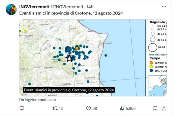 Continua a tremare la terra in Calabria. Decine di scosse di terremoto sono state registrate nelle ultime ore nel territorio di Crotone. Le due principali, di magnitudo 3.7 e 3.8, sono state segnalate dall’Istituto nazionale di geofisica e vulcanologia (Ingv) alle 15.22 e alle 15.31 del 12 agosto rispettivamente a una profondità di 25 e 27 chilometri. A questi due eventi ne sono seguiti molti altri: circa una trentina e tutti di magnitudo tra 2 e 3.3. Lo sciame sismico è proseguito fino all’alba di oggi, 13 agosto. L’ultima scossa è stata di magnitudo 2.0 alle 6.50 a una profondità di 28 km a Cirò.