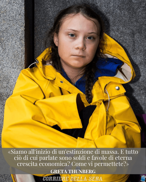La nostra casa é in fiamme. Sono qui per dirvi che la nostra casa è in fiamme. Secondo L’IPCC (Gruppo intergovernativo sul cambiamento climatico) siamo a meno 12 anni dal non essere in grado di annullare i nostri errori. In posti come Davos, alle persone piace raccontare storie di successo ma il loro successo finanziario e costato un prezzo impensabile. E sul cambiamento climatico dobbiamo riconoscere che abbiamo fallito. Tutti i movimenti politici nelle loro forma attuale lo hanno fatto e i media non sono riusciti a creare un’ampia consapevolezza pubblica. Ma l’Homo sapiens non ha ancora fallito . Si stiamo fallendo, ma c’è ancora tempo per cambiare tutto. Possiamo ancora sistemrlo. Abbiamo ancora tutto nelle nostre mani. Adesso è il momento di parlare chiaramente. Risolvere la crisi climatica è la sfida più grande e complessa che L’Homo sapiens abbia mai affrontato. La soluzione principale, tuttavia, è così semplice cheanche un bambino piccolo può capirlo dobbiamo fermare le emissioni dei gas serra. O lo facciamo o non lo facciamo…