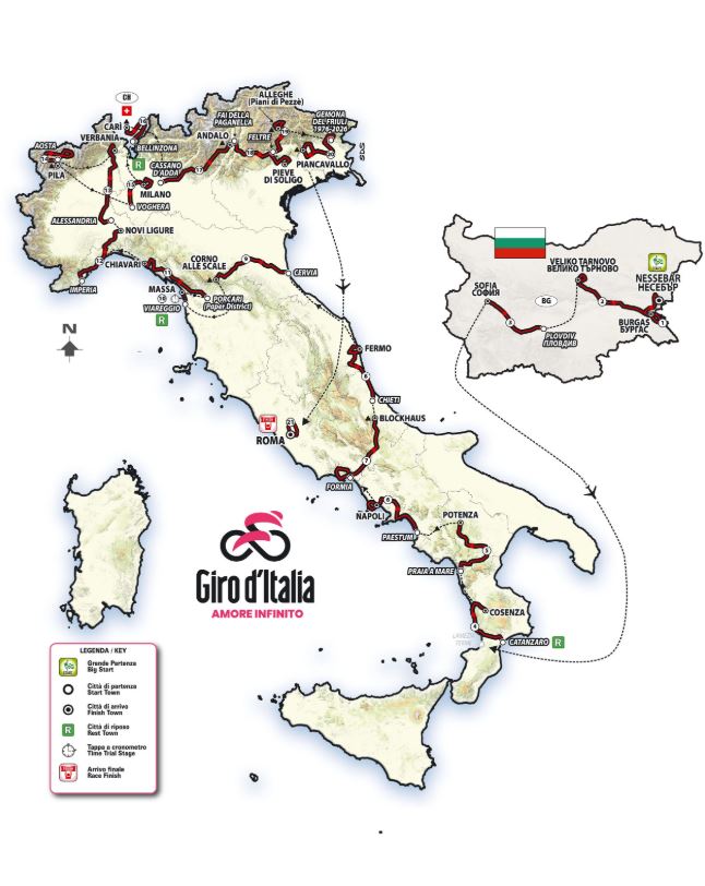 Ecco il Giro d’Italia 2026: l’edizione n° 109 (la prima fu nel 1909) della corsa rosa, in calendario da venerdì 8 a domenica 31 maggio, è stata presentata oggi all’Auditorium Parco della Musica Ennio Morricone di Roma. La grande partenza sarà dalla Bulgaria, per la prima volta nella storia (per la 16ª volta si prende il via dall’estero), dove si svolgeranno le prime tre frazioni. Grande arrivo a Roma – per l’ottava volta, la quarta consecutiva dal 2023 – dopo 3.459 km e 49.150 metri di dislivello in 21 tappe. Questi i dati tecnici più salienti, in sintesi: 1 cronometro individuale pianeggiante di 40.2 km, 8 tappe di pianura, 7 di media montagna e 5 di alta montagna con 7 arrivi in salita. La Cima Coppi – il punto più alto – sarà il Passo Giau con i suoi 2.233 metri.