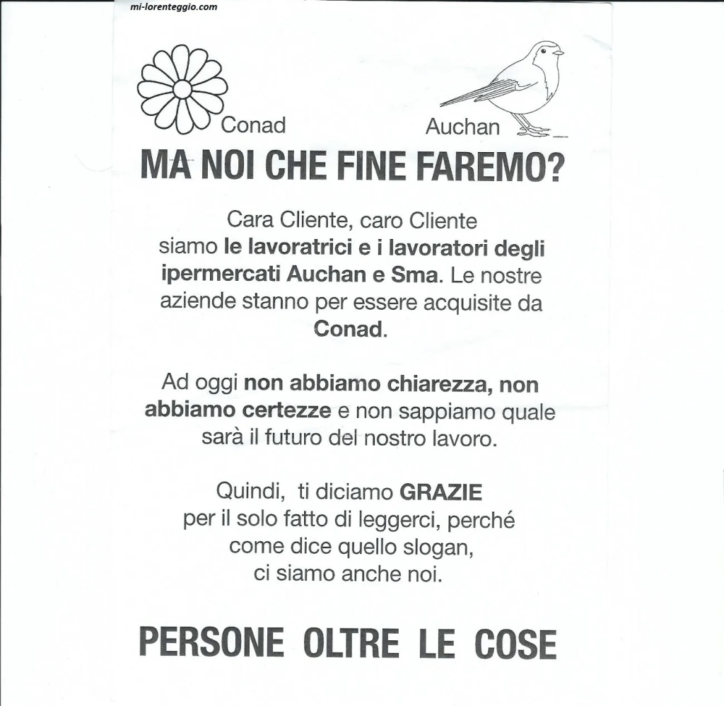 Al contempo però, desta preoccupazione che il gruppo, probabilmente a causa di un’organizzazione completamente diversa da Auchan – Conad è un consorzio di cooperative con migliaia di piccoli imprenditori – non abbia al momento presentato nessun piano su come intende riorganizzare e gestire i vari centri. Anche in un recente incontro presso il MISE, il gruppo non ha fornito nessun tipo di elemento sul futuro dei vari ex-Auchan, se non un vago riferimento alla “continuità aziendale” che di certo non può essere vista come una garanzia da parte dei tanti lavoratori.