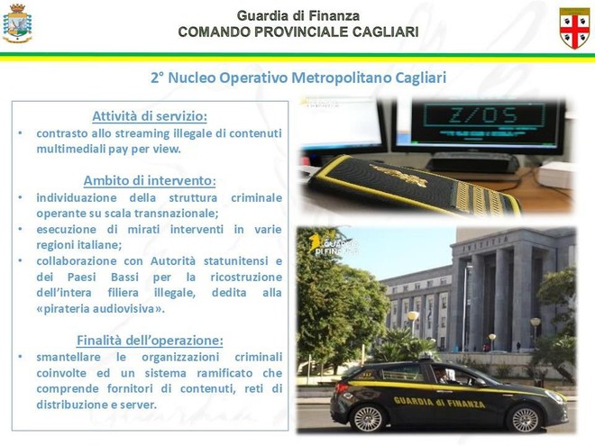 | “questa operazione rappresenta un tassello fondamentale nella lotta contro la pirateria audiovisiva. La forte sinergia tra la Procura della Repubblica cagliaritana e le Fiamme gialle permette, da una parte, di smantellare le organizzazioni criminali che operano in questo settore, dall’altra, di sanzionare penalmente e amministrativamente tutti i potenziali acquirenti in fase di identificazione”. |